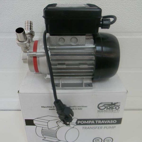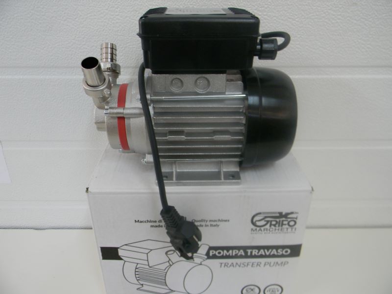 Pompă centrifugală  transvazare vin si alte lichide alimentare si nealimentare, turbina inoxidabila, capacitate variabila cuprinsa Intre 800 – 1.700 L/h (29ltr/min), inaltime maxima refulare variabila Intre 12 – 24 m, diametru iesire turbina 20 mm. Motor monofazic la 220V cu putere de 380W la 2800 rpm, comutator de schimbare sens. Ele sunt reversibile, adica se poate schimba sensul de rotatie a rotorului, incat absortia sa devina refulare si invers. Pompa cantareste 5 kg. Poate fi utilizata ca si electropompa de schimb pentru filtru vin.