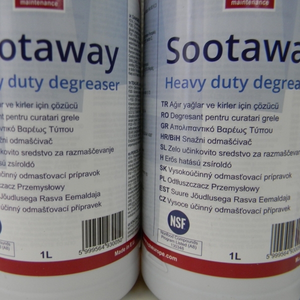 SOOTAWAY agent de degresare pentru echipamente din industria alimentara, PROFESIONAL, penetreaza grasimea, tartrul de pe butoaie sau damigene, creozotul, depunerile calcinate, praful de carbune si impuritatile, petele de sange, nelasand pelicule de solutie sau miros respingator dupa curatare-fiind biodegradabil. Este un produs AMERICAN ce se dilueaza cu apa incepand de la 1:3 pana la 1:10, devenind economic.