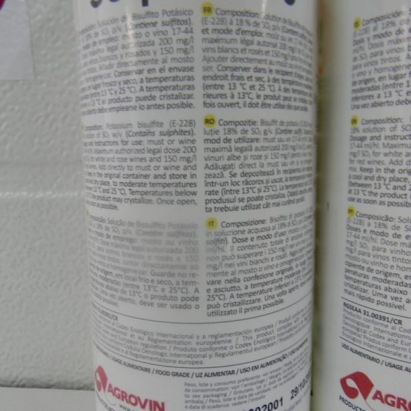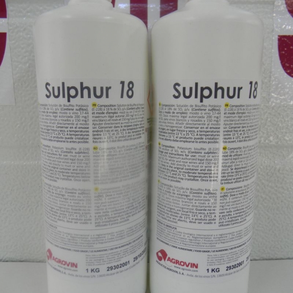 Sulphur 18 este o solutie apoasa de bisulfit de potasiu in concentratie de 18%, 1 litru de solutie elibereaza o cantitate de 180gr SO2.In vinificatie este folosit ca agent antioxidant si antimicrobian.